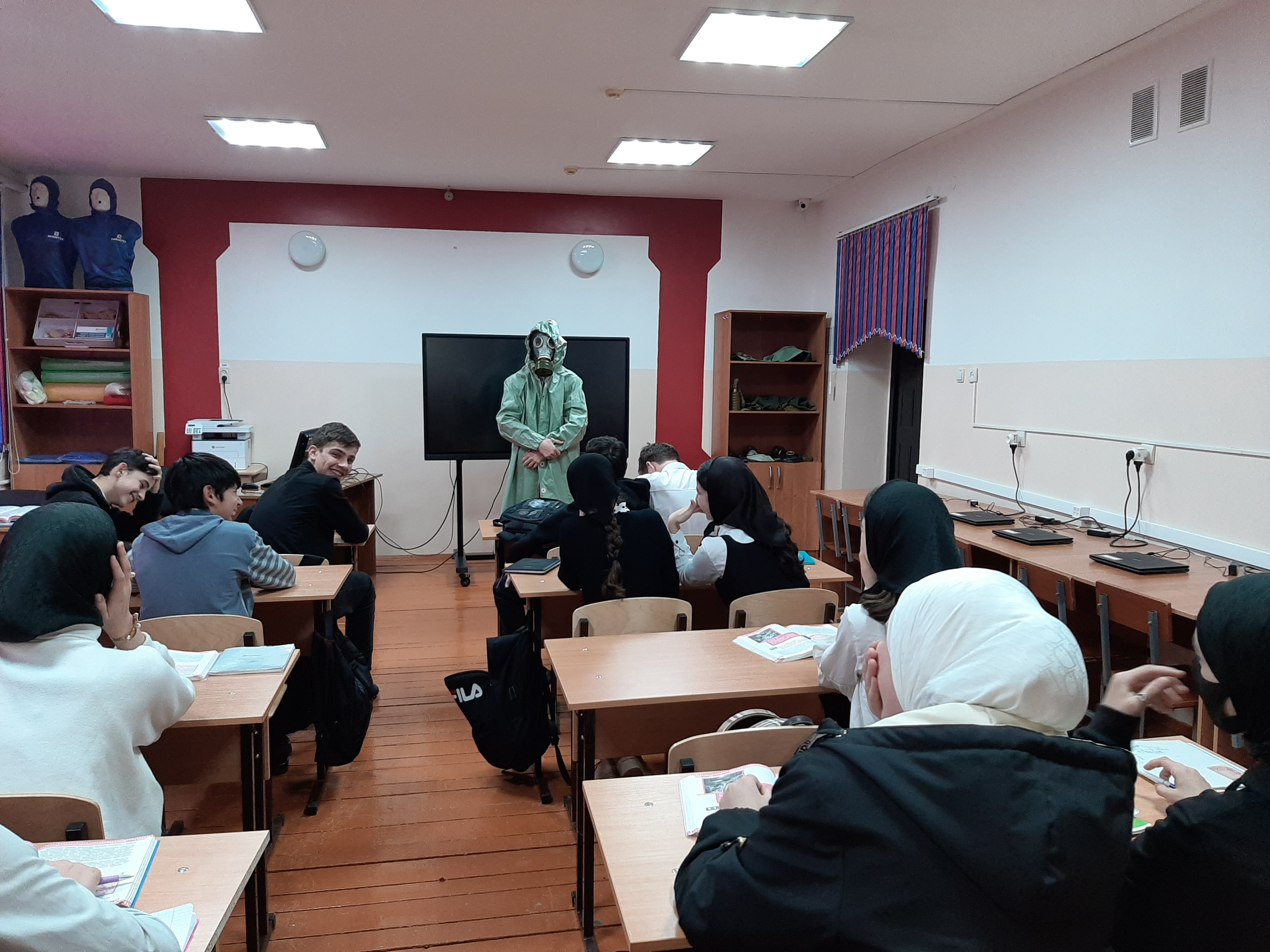 Для обучающихся была организована демонстрация средств индивидуальной защиты: респираторы, противогазы, ватно-марлевые повязки, ОЗК.
