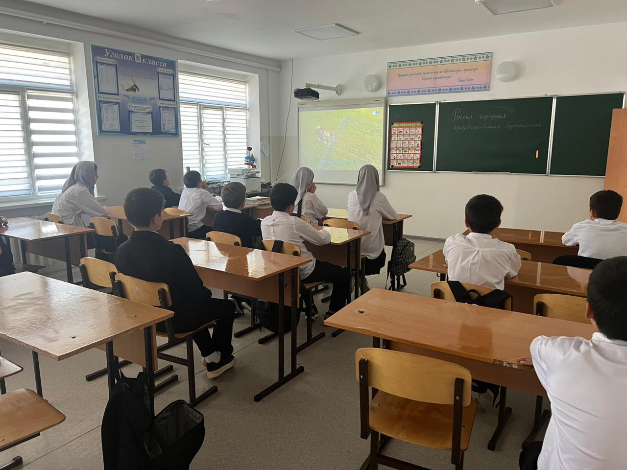 На уроке детям был представлен рассказ с иллюстрациями и фактами о ключевых направлениях сельского хозяйства (растениеводство, животноводство, пищевая промышленность), была отмечена роль России на мировом рынке продовольствия (экспорт, самодостаточность), представлены примеры современных технологий и инициатив в аграрном секторе (биотехнологии, устойчивое сельское хозяйство).