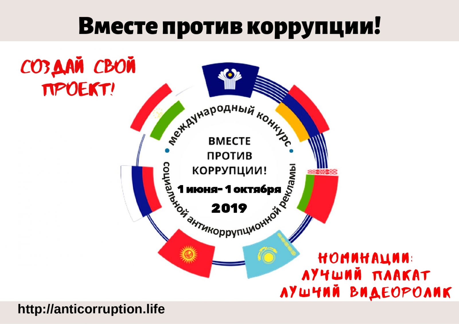 В 2019 году Генеральная прокуратура Российской Федерации выступает организатором Международного молодежного конкурса социальной антикоррупционной рекламы на тему «Вместе против коррупции!». К участию приглашаются молодые люди в возрасте от 14 до 35 лет , которым предлагается подготовить антикоррупционные плакаты и видеоролики на тему «Вместе против коррупции!». Торжественную церемонию награждения победителей конкурса планируется приурочить к Международному дню борьбы с коррупцией (9 декабря). Прием работ будет осуществляться с 1 июня по 1 октября 2019 г. на официальном сайте конкурса www.anticorruption.life